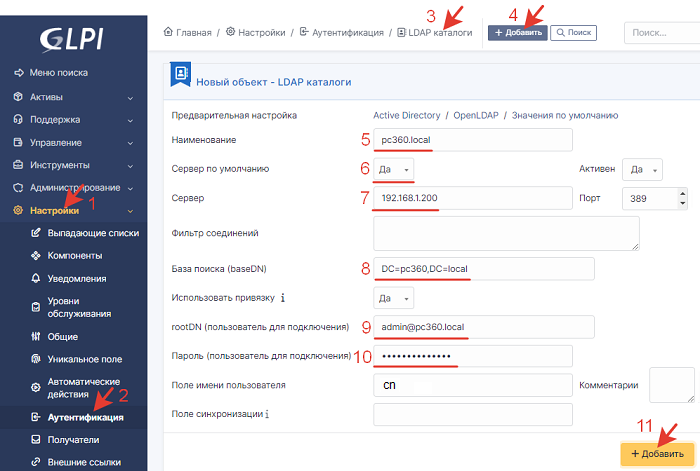 База поиска (baseDN): DC=pc360, DC=local Ваш домен. (все буквы в названии нижнего регистра)