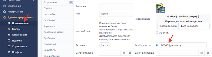 Администрирование >> Профили >> Technician >> Поддержка >> Заявки.