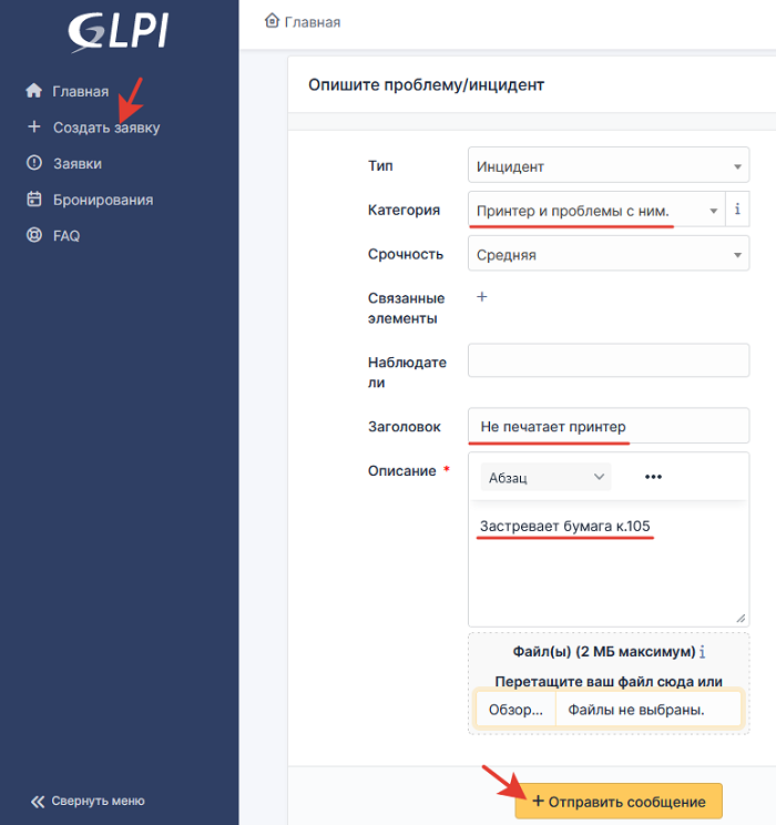 Заявка приходит на сервер GLPI. Происходит оповещение в Telegram-бот (и/или email) персонала тех. поддержки.