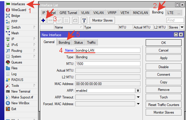 /interface bonding add mode=802.3ad name=bonding-AS slaves=ether1,ether2 transmit-hash-policy=layer-3-and-4 |