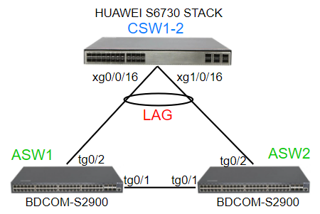 LAG – это логический интерфейс, который объединяет физические порты в одну связку, ожидает, что каждый порт в группе ведёт к одному и тому же логическому соседу. Huawei «думает», что у него два линка ведут к одному коммутатору. А на самом деле – это два разных коммутатора BDCOM, которые соединены между собой обычным способом. Это допустимая схема, называется «multi-chassis LAG» (M-LAG), но поддерживается она только на оборудовании, где коммутаторы управляются как единое логическое устройство. Т.е. коммутаторы BDCOM должны соединятся друг с другом в стек или в M-LAG по определенной технологии. К сожалению никаких подобных технологий в модели S2900 не предусмотрено.