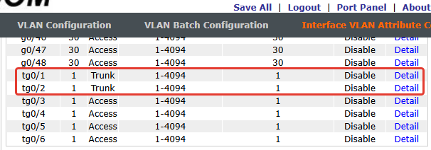 На порты tg0/1 tg0/2 таким же способом назначаем транк.