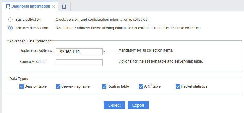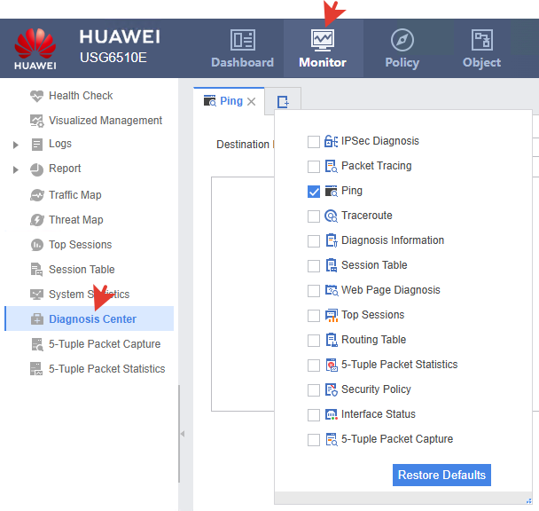 Diagnostic Center – центр диагностики. Это раздел, предназначенный для диагностики работы USG и прохождения сетевого трафика. Он объединяет инструменты, позволяющие выполнять тесты, анализировать пакеты, проверять сессии, маршруты, безопасность и состояние интерфейсов. Используется для поиска причин недоступности ресурсов, анализа прохождения трафика, проверки работы туннелей, политик и маршрутов, выявления конфигурационных ошибок.