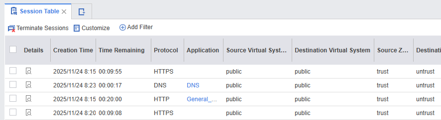 Session Table – просмотр текущих сессий: параметры соединений, порты, протоколы, таймеры, объём переданного трафика.