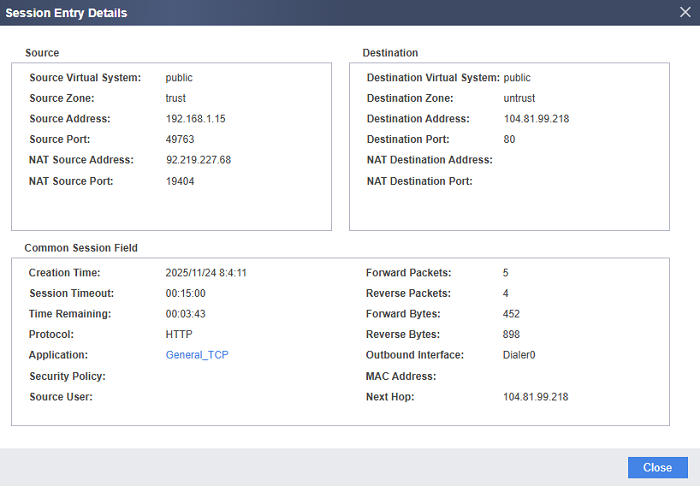 Export – это детальный лог реальной обработки пакета внутренним движком сессий USG. Если flowchart – это визуальная схема, то Export – это «сырой лог движка». Он показывает каждый этап, через который проходит пакет, и что с ним делает USG.
