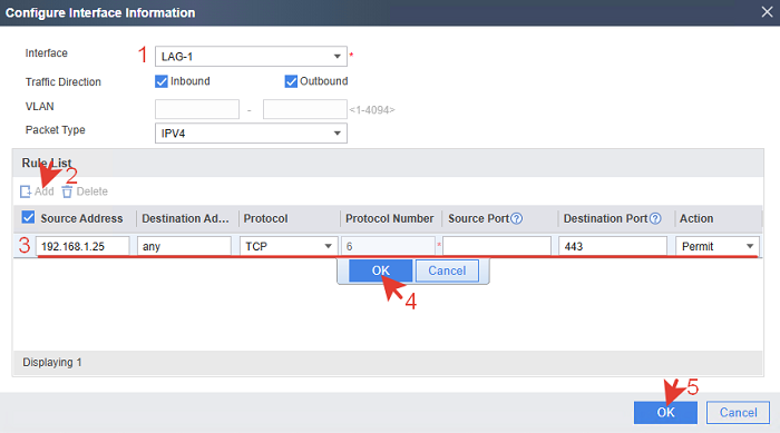 В интерфейсе нужно указать 5-tuple в виде добавления правила. Указываем IP-адрес источника, назначения (any=любой), протокол и порты. В данном случае для примера выбран распространенный порт 443.
