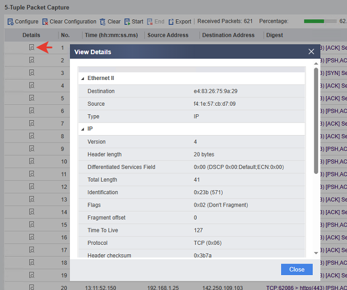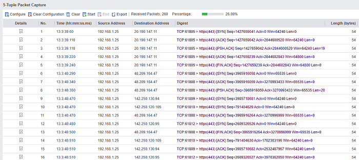 5-Tuple Packet Capture – захват пакетов для анализа на основе 5-туплета: позволяет видеть реальные пакеты, проходящие через устройство.