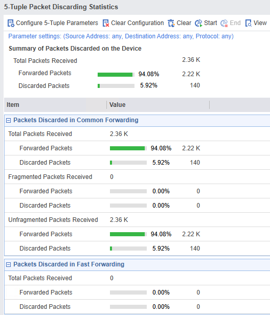 5-Tuple Packet Discarding Statistics показывает, сколько пакетов, подходящих под заданный 5-tuple фильтр, устройство реально получило, передало и/или отбросило. Фактически это счётчики прохождения трафика через движок обработки, удобный механизм для отладки ACL, NAT и маршрутизации.