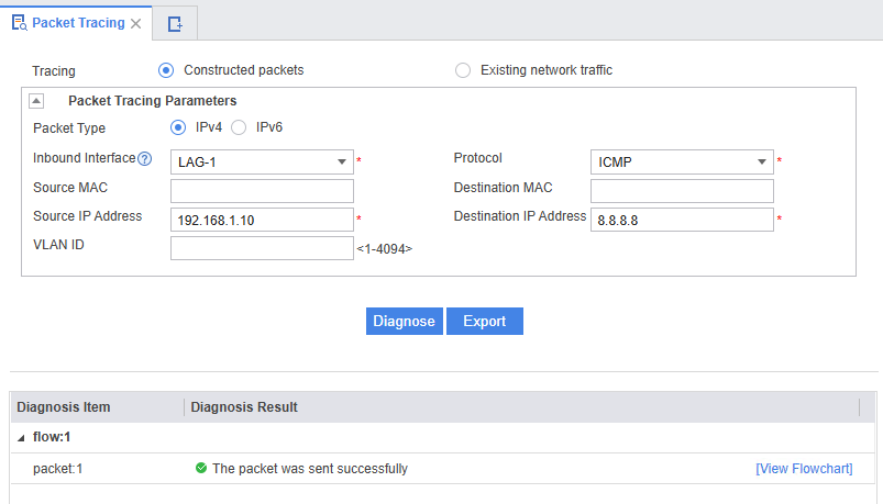 Diagnosis Result: The packet was sent successfully – сообщается, что пакет успешно прошёл все этапы внутри устройства.