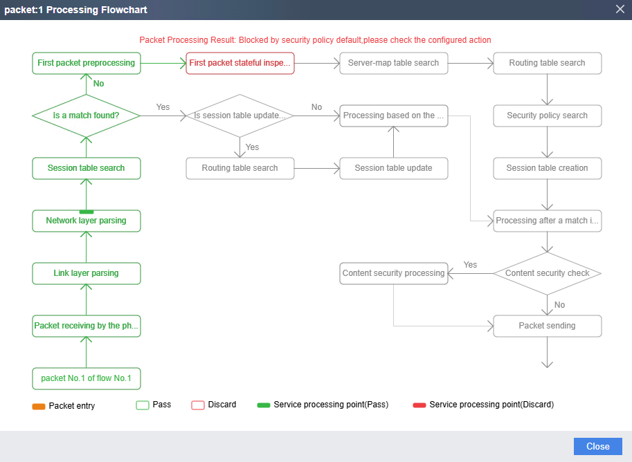 В данном случае обработка трафика завершилась на First packet stateful inspection. На этом этапе выполняется первичная проверка пакета до применения политики безопасности. Это базовая stateful-проверка, в которую входят: