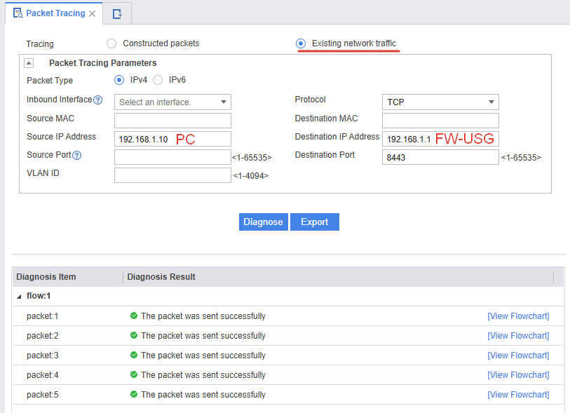 Режим Existing network traffic означает: попробовать отследить реальный трафик, уже проходящий через USG firewall, и попытаться построить flowchart для уже существующих пакетов.