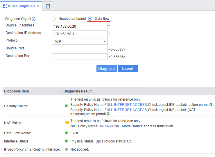 IPSec Diagnosis – проверка состояния IPSec-туннелей: фазы I/II, параметры SA, алгоритмы, ошибки и статус установления.