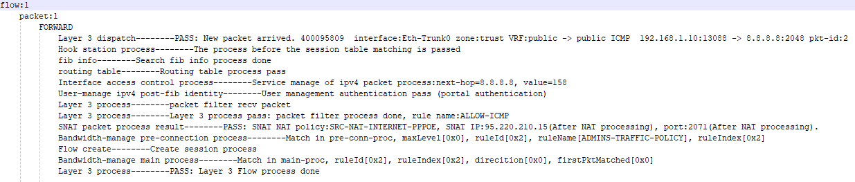 Layer 3 dispatch – PASS: USG Firewall получил новый пакет: интерфейс на входе: Eth-Trunk0 зона: trust VRF: public протокол: ICMP источник: 192.168.1.10 назначение: 8.8.8.8.