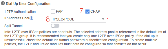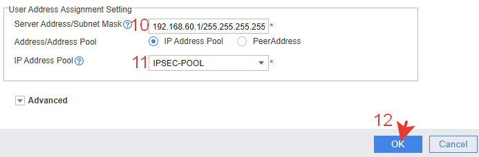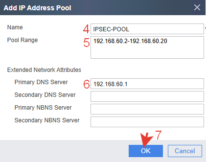 system-view ip pool IPSEC-POOL section 0 192.168.60.2 192.168.60.20 dns-list 192.168.60.1 |
