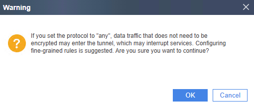 Далее стандартное предупреждение. Оно появляется, когда выставлены значения any, потому что USG думает, что весь трафик может идти через IPSec, даже тот, который шифровать не нужно. Нажимаем ОК.