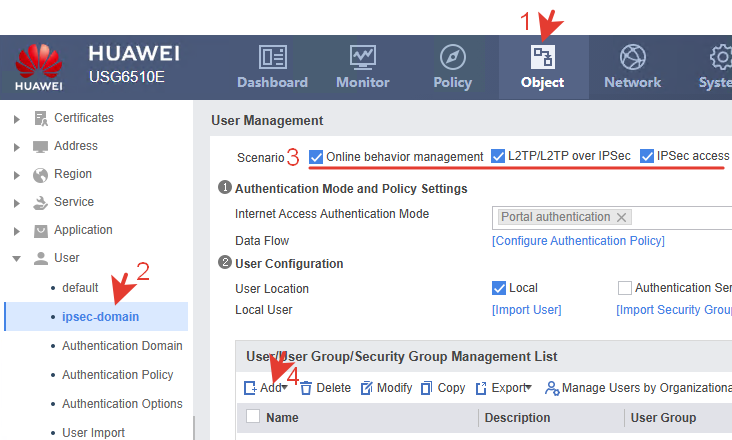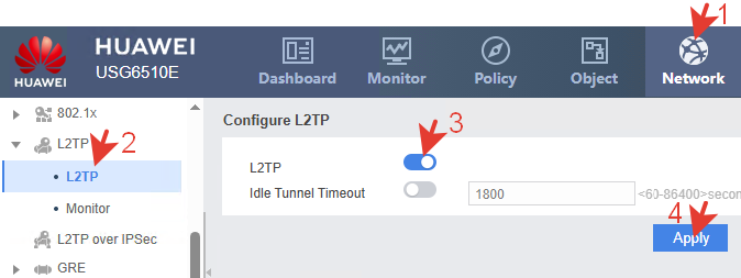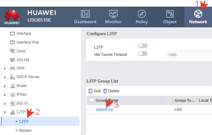 L2TP/IPSec на Huawei USG6510E – это технология организации защищённого удалённого доступа, где протокол L2TP используется для создания логического туннеля, а IPSec обеспечивает шифрование и аутентификацию трафика. В сочетании они позволяют безопасно подключать удалённых пользователей к корпоративной сети через Интернет.