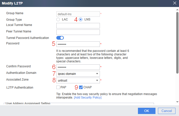 Pre-shared key: Pass-135 – общий заранее согласованный ключ. Стандартный и единственно используемый вариант для L2TP/IPSec. Это пароль, который должен совпадать на обеих сторонах – на USG и на устройстве клиента. Вводим сложный пароль из не менее 8 букв разного регистра, цифр и спец.символов.