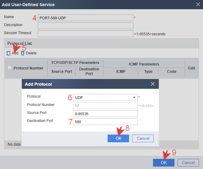 system-view ip service-set PORT-500-UDP type object service 0 protocol udp source-port 0 to 65535 destination-port 500 ip service-set PORT-4500-UDP type object service 0 protocol udp source-port 0 to 65535 destination-port 4500 |