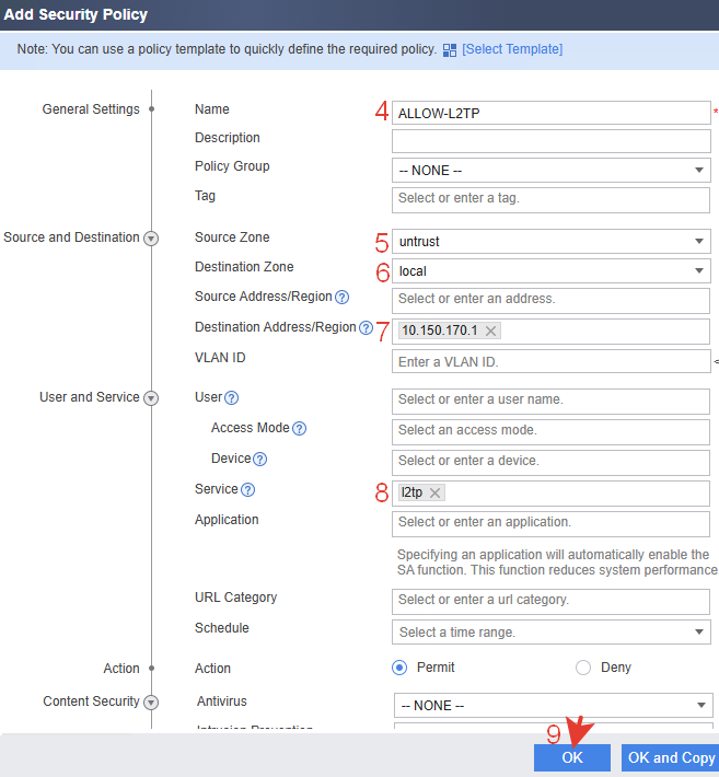 system-view security-policy rule name ALLOW-L2TP source-zone untrust destination-zone local destination-address 10.150.170.1 mask 255.255.255.255 service l2tp action permit quit |