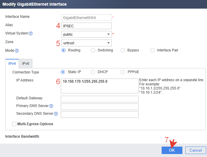 system-view interface GigabitEthernet0/0/4 undo shutdown ip address 10.150.170.1 255.255.255.0 alias IPSEC-VPN service-manage ping permit quit |