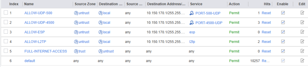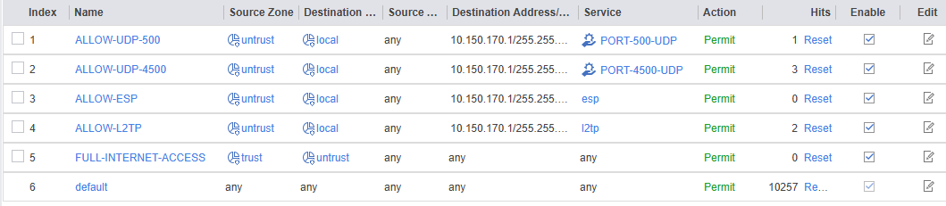 security-policy rule move ALLOW-L2TP before FULL-INTERNET-ACCESS rule move ALLOW-UDP-500 before FULL-INTERNET-ACCESS rule move ALLOW-UDP-4500 before FULL-INTERNET-ACCESS rule move ALLOW-ESP before FULL-INTERNET-ACCESS quit |