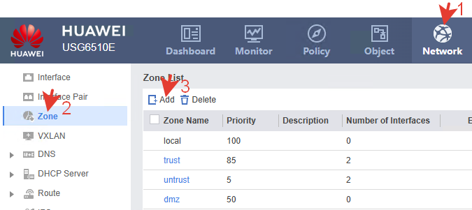 В данном случае трафик проходит через USG (forward) от клиента к серверу. Разрешаем трафик от источника к назначению по IP-адресу. Общие forward-правила из untrust в trust это плохая практика. Сузим правило с помощью зоны безопасности. Создаем новую зону с произвольным приоритетом.