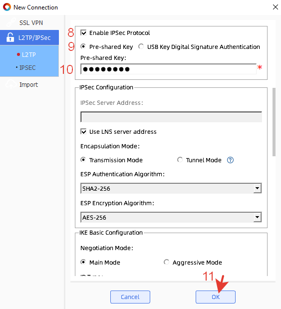 Pre-shared Key – тип аутентификации. И далее вводим пароль, такой же как в настройке политики IPSec USG.