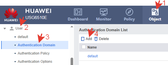 aaa (authentication, authorization, accounting) – единая система управления доступом на USG. Настройки схемы и домена выполняются через неё.