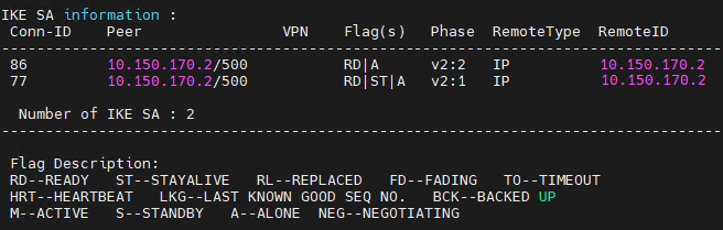 Показывает состояние IKE Security Associations – этапы и параметры обмена ключами IKEv2, на которых основан IPSec-туннель. В выводе команды можно посмотреть список IKE-сессий и их Conn-ID, IP-адрес пира (peer), фазу, статус/флаги SA и др. Это всё используется для проверки успешной установки IKE-фазы, диагностики отказов, просмотра текущего состояния обмена ключами.