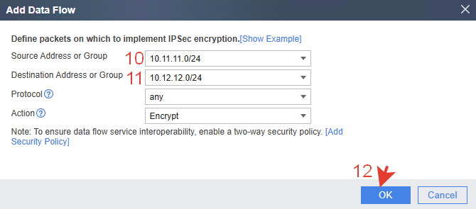 При нажатии на кнопку-ссылку в настройке Data Flow, Huawei USG предлагает создать правило без указания зон, потому что decrypted IPsec traffic не находится в зоне untrust, хотя пришёл оттуда. Такой способ работает. Но правильно всё же указывать source-zone и destination-zone, чтобы USG мог корректно применить правила. В любом случае наличие конкретных IP-адресов в правиле значительно снижает риск, даже если зоны не указаны. Создаем два правила в перекрестных направлениях LAN1 в LAN2 и LAN2 в LAN1.
