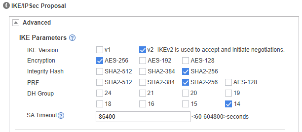 ike proposal 1 encryption-algorithm aes-256 dh group14 authentication-algorithm sha2-256 authentication-method pre-share integrity-algorithm hmac-sha2-256 prf hmac-sha2-256 |