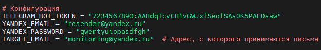 TELEGRAM_BOT_TOKEN = "7234567890:AAHdqTcvCH1vGWJxfSeofSAs0K5PALDsaw" YANDEX_EMAIL = "resender@yandex.ru" YANDEX_PASSWORD = "qwertyuiopasdfgh" TARGET_EMAIL = "monitoring@yandex.ru" |
