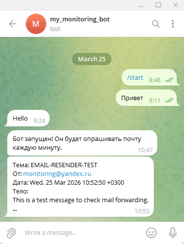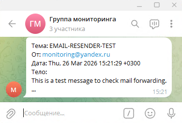 На этой странице представлен один из способов пересылки сообщений из электронной почты в мессенджер Telegram. Такое оповещение необходимо для администраторов сетей в тех случаях, когда нет круглосуточных дежурных на мониторинге и необходимо оперативно получать информацию о возникающих событиях.