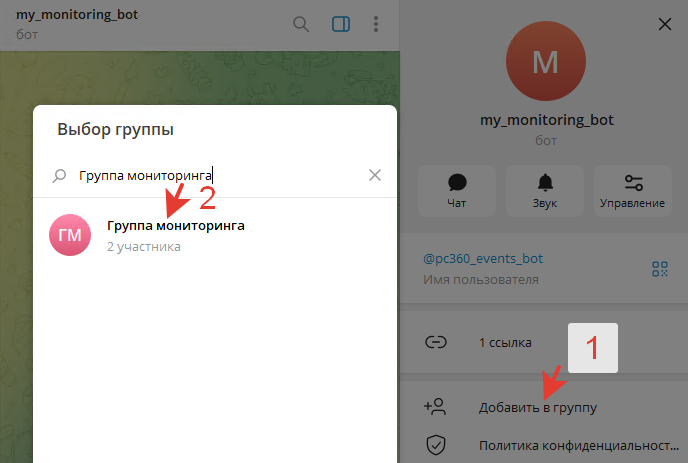 Добавляем в эту группу созданного ранее бота и админов.