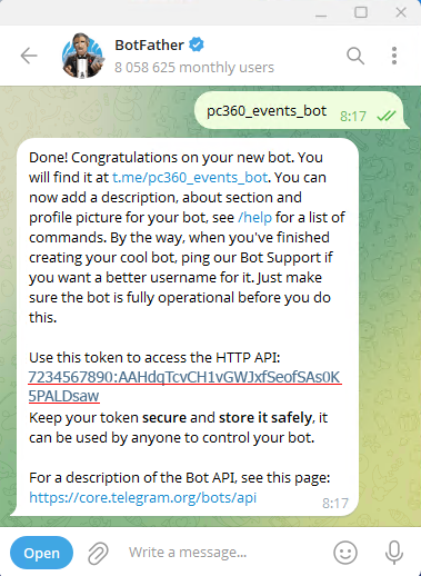 Токен нужно хранить в безопасном месте, так как им может воспользоваться любой желающий для управления вашим ботом.