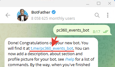 Переходим в нашего созданного бота по ссылке из сообщения BotFather.